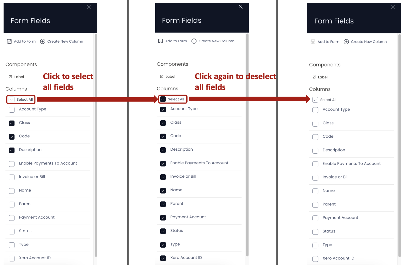 • You can select all columns and deselect all columns in the Form Fields panel with a single click.